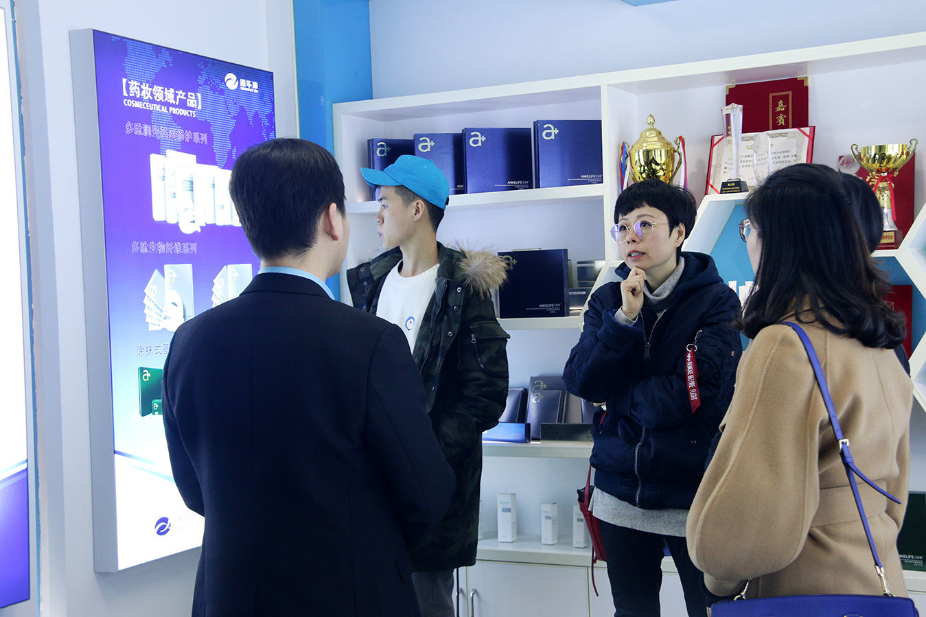 李坤經理講解結束,一行人便來到鑫華坤的工作室,近距離接觸安科麗品牌,經過簡單的了解后,由安科麗產品部經理李揚老師做更深層次的講解,從生物科技的運用到產品的使用方法,每一款產品都能看出安科麗人的用心,由此,908電臺的合作伙伴才對安科麗有了系統全面的認識。