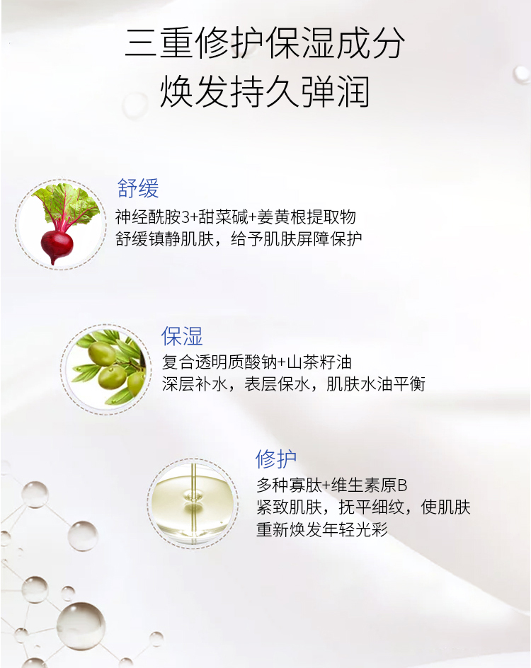 ★修護肌底:多種活性成分,深入肌底修護受損細胞,促進彈性纖維,膠原蛋白合成,賦活肌膚年輕彈性。