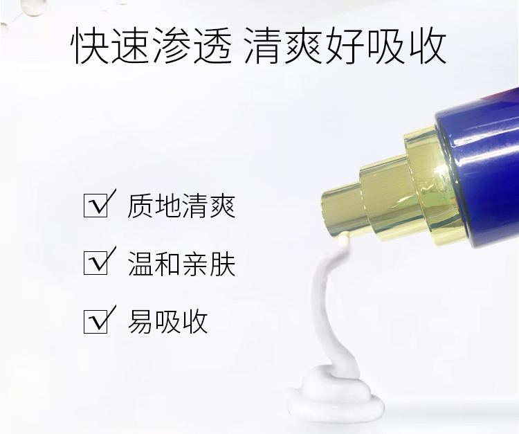 白色乳液狀,清透易涂抹,延展性好,無粘膩感,水潤清爽,無色素無香精。