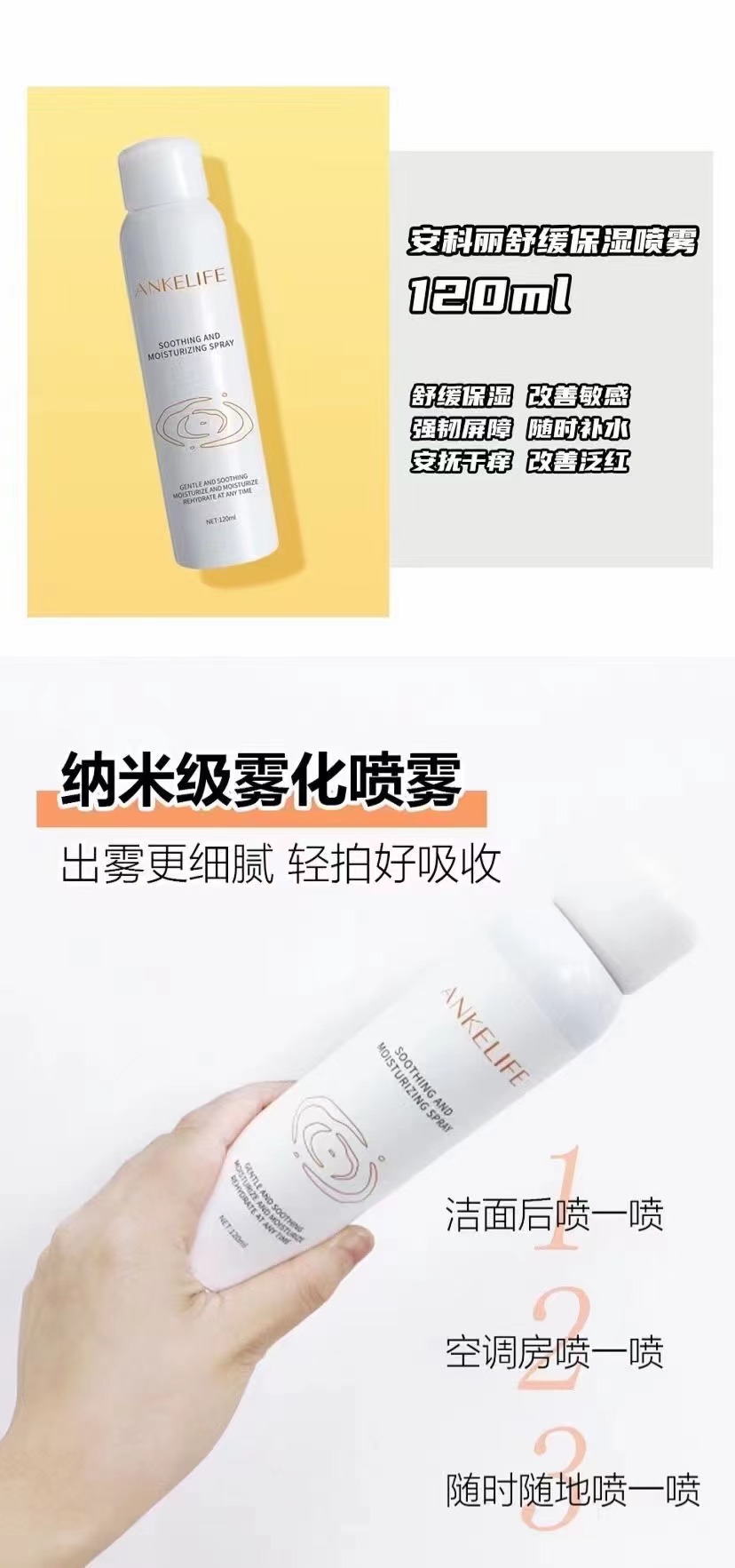 安科麗噴霧采用二元包裝,鋁罐包裝,無防腐劑添加,敏感肌可用,且無污染。使用時按壓噴頭很輕易就能將里料體乳霧般噴灑出來,內含料體可利用性高達99%。