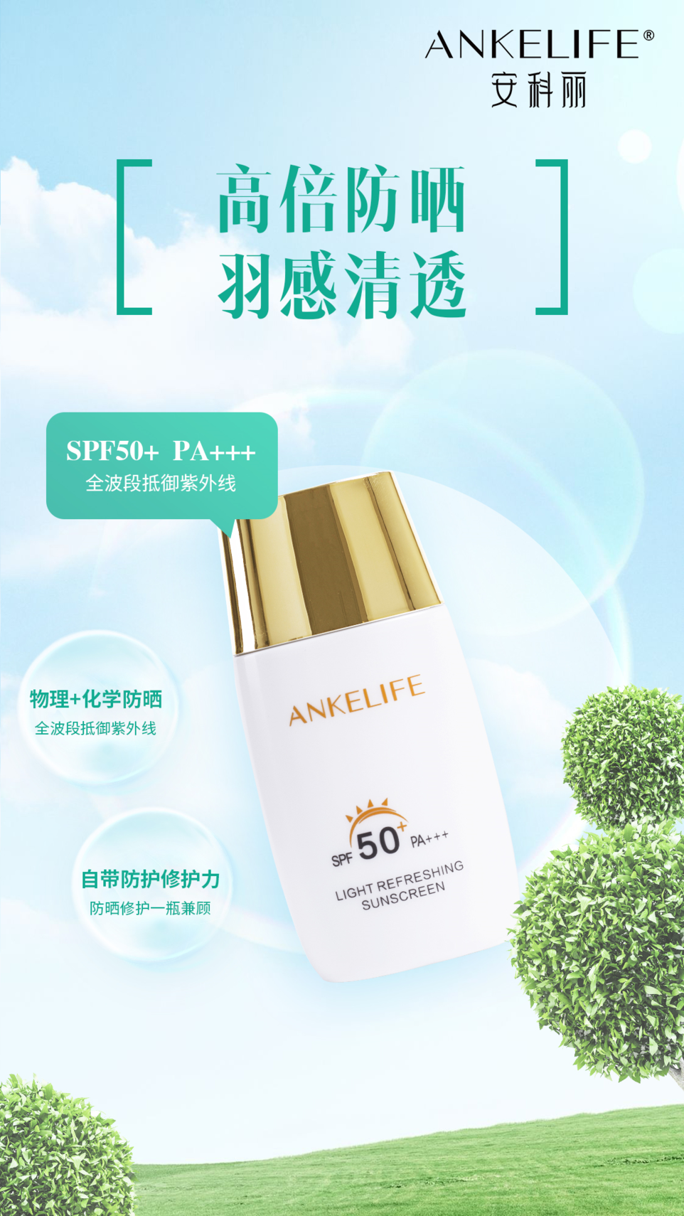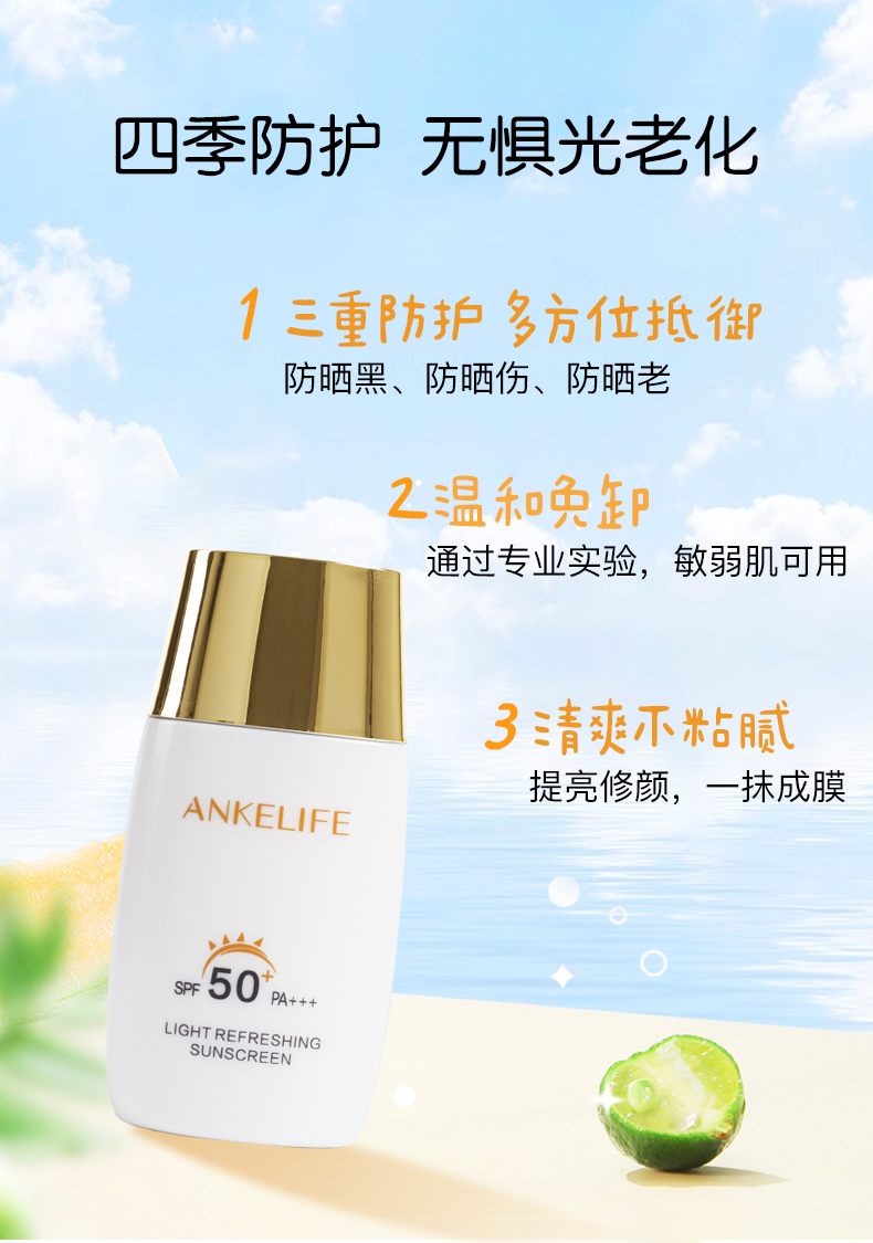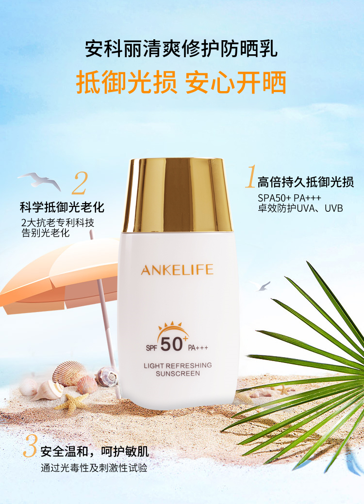 所以基于以上問題,在解決懶惰的同時,一定要擁有一款清爽、高倍、不假白、還能抗光老的防曬霜——安科麗清爽修護防曬乳。